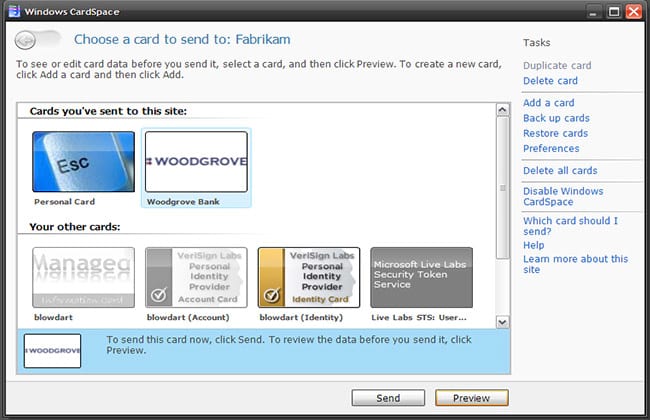 CardSpace – 2005 ~ 2011 (7 anos) – Lançado inicialmente como InfoCard, foi disponibilizado inicialmente com o .NET Framework 3.0 para Windows XP, Windows Server 2003 e Windows Vista. A ideia da Microsoft era que o serviço fosse uma forma de evitar o roubo de identidades online, combatendo phishing, por exemplo. No entanto, o serviço não emplacou, pois a tecnologia era muito complicada para o usuário doméstico, e, durante muito tempo, não se conectava a nenhum outro serviço. Foi substituído pelo nosso próximo item da lista, o U-Prove.